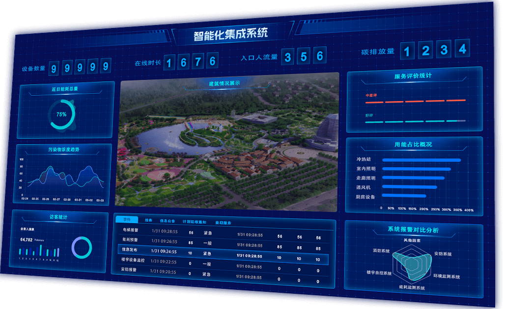 將建筑的弱電子系統(tǒng)進(jìn)行集成,基于可視化顯示與配置,進(jìn)行集中監(jiān)視和管理,可直觀展示系統(tǒng)實(shí)時(shí)運(yùn)行參數(shù)及狀態(tài)。