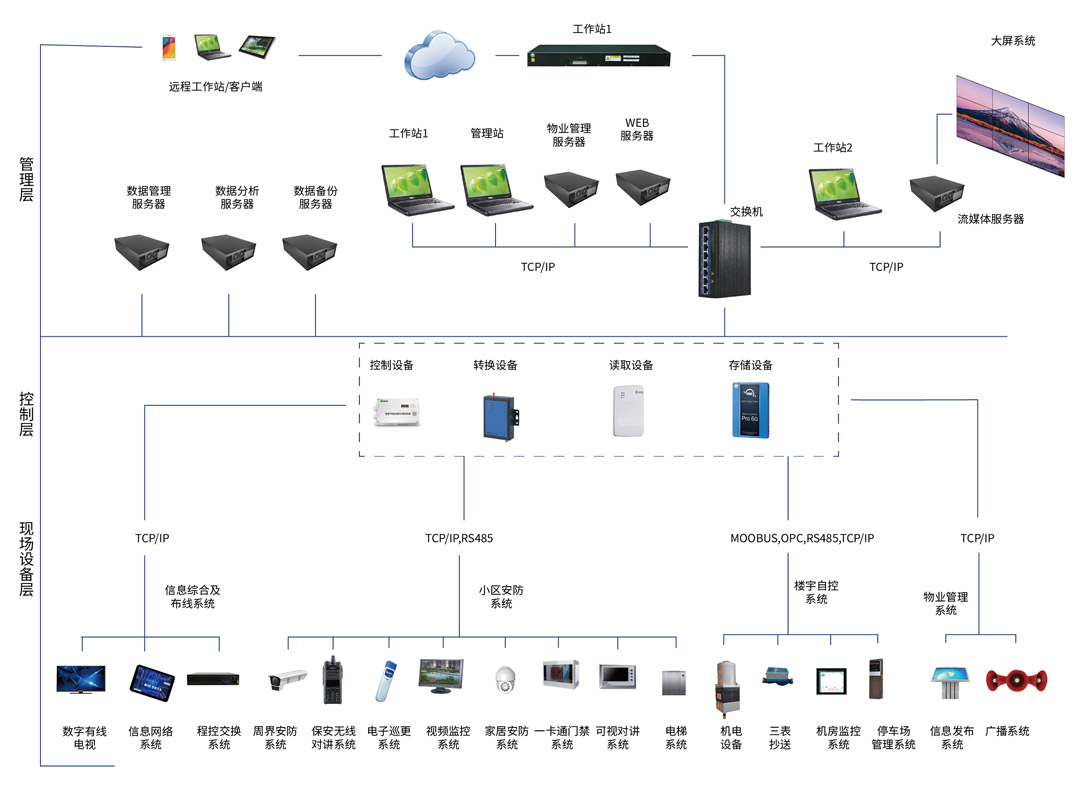 智能化集成系統(tǒng)是基于互聯(lián)網(wǎng)、物聯(lián)網(wǎng)、私有云、大數(shù)據(jù)、AI識(shí)別等技術(shù)為核心,高于智能化系統(tǒng)的綜合性智能化管理平臺(tái)。將具備不同功能的建筑智能化系統(tǒng),通過(guò)統(tǒng)一的信息平臺(tái)集成,對(duì)各個(gè)子系統(tǒng)全程集中監(jiān)視和管理。使各個(gè)原本獨(dú)立的子系統(tǒng),在統(tǒng)一的平臺(tái)上互相交互,形成信息匯集、資源共享及優(yōu)化管理等綜合功能的智能化集成管理平臺(tái)。